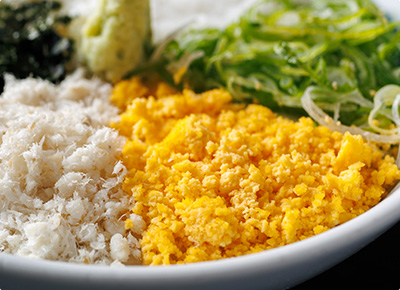 鯛の身と卵のそぼろ、お好みの薬味をご飯の上にのせ、特製の出汁をかけてお召し上がりください。